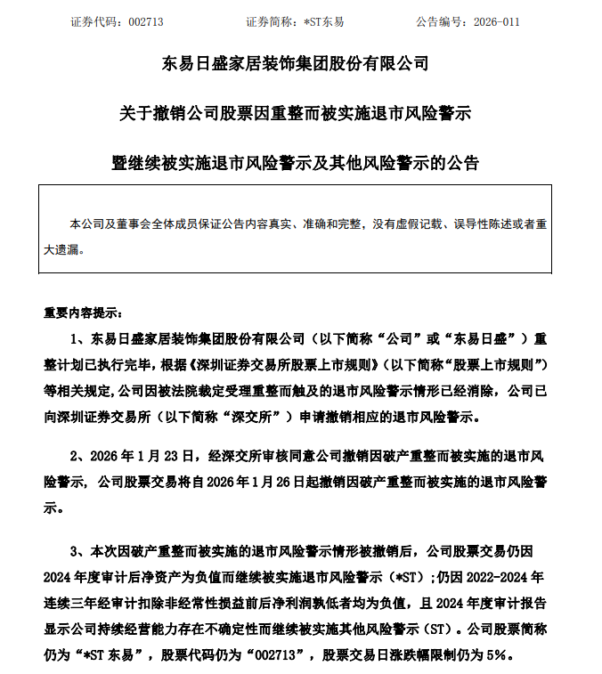 1月23日,*ST东易(002713.SZ)公告,公司重整计划已执行完毕,根据相关规定,公司因被法院裁定受理重整而触及的退市风险警示情形已经消除,公司已向深交所申请撤销相应的退市风险警示。2026年1月23日,经深交所审核同意公司撤销因破产重整而被实施的退市风险警示,公司股票交易将自2026年1月26日起撤销因破产重整而被实施的退市风险警示。